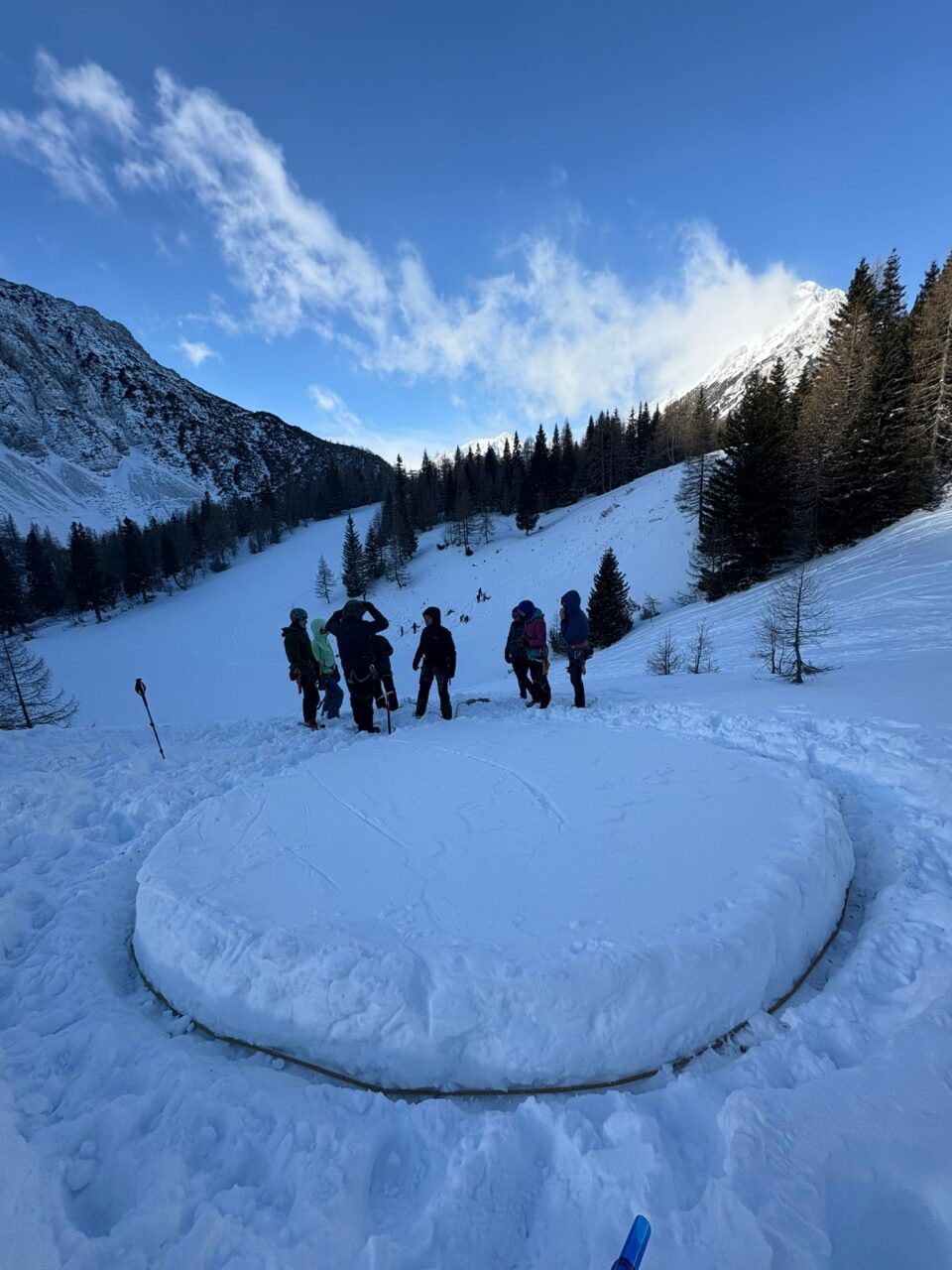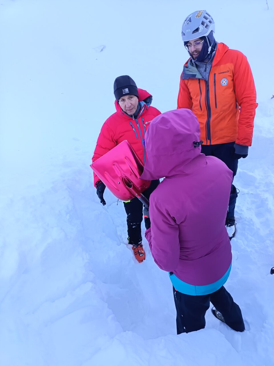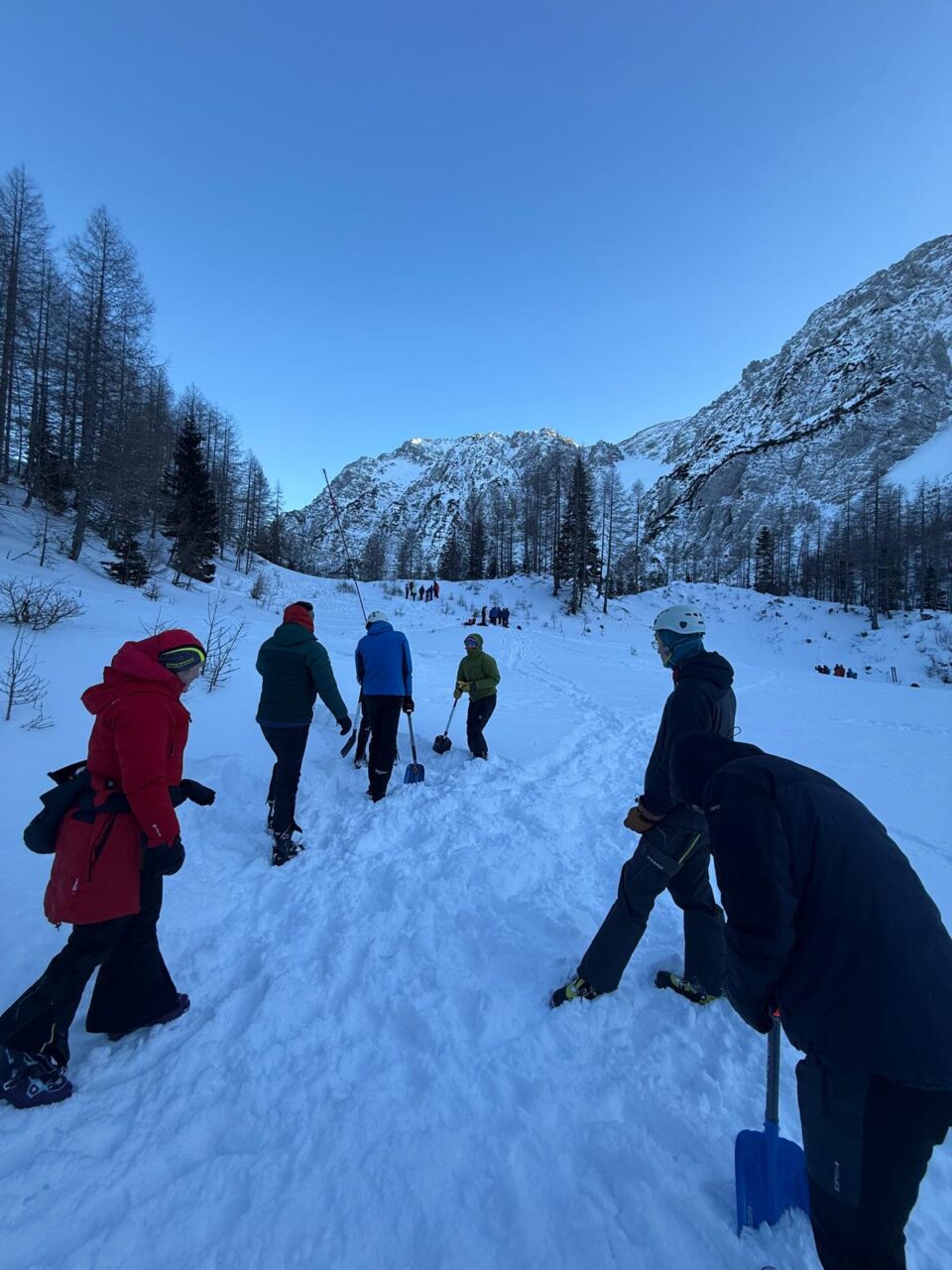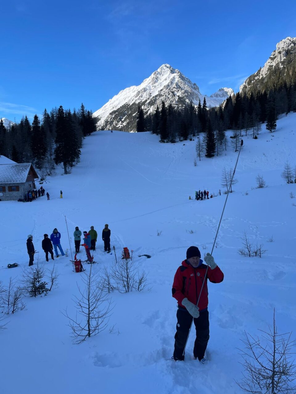 Ker nam je prikaz bil tako všeč, da smo ignorirali padajočo temperaturo in ledeni veter, smo vaje podaljšali za celo uro. Zato nam je zmanjkalo časa za kosilo in vmesni dvig telesne temperature v topli koči. Večina se nas je takoj po zaključku dopoldanskega dela porazdelila po treh postajah, ki so jih pripravili gorski reševalci. Stojko nam je prikazal vrste prerezov snežne odeje z namenom, da bi se izognili uporabi znanja, ki je bilo prikazano na naslednjih dveh postajah. Katarina in Jojo sta pripravila teren za iskanje zasutega v plazu. Ponovno smo slišali, da je lavinski trojček vedno trojček, ne enojček in da je tovariška pomoč ključna pri reševanju življenj. Pa tudi to, da smo reševalcem na mestu nesreče lahko v veliko pomoč, ne pa v napoto, kot smo domnevali. Na zadnji postaji je s tehniko sondiranja in odkopavanja zasutega v plazu dala piko na i še Zala. Kot zdravnica pri GRS je zelo nazorno ilustrirala možne posledice napak v zimskih razmerah, posebej v plazu. Kakorkoli, prerezov ni za podcenjevat.