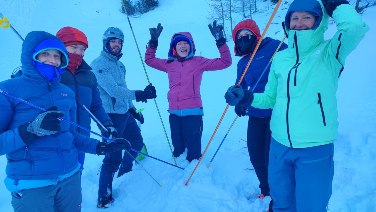 Vajo hoje z derezami in s cepinom smo preživeli v pričakovanju adrenalinskega ustavljanja s cepinom. Tukaj smo se kljub uvodni zadržanosti (drča je bila že fino spulirana) prav razigrali in se nasmejali, večinoma drug drugemu, kakšen pa tudi sam sebi. Najbolj jo je odnesel Klemen, ki se je na račun tečajnikov zabaval kar celo dopoldne, zmagovalna postaja za inštruktorja. Kako telo spraviti v ta prav položaj, je bil za nekatere izziv že pri padcu, kaj šele pri ustavljanju. Potem pa skoordinirati roke, težišče, stopala v zrak…možgani preprosto niso sledili. Ena bolj zabavnih vaj, dobro, da jo je fino vsako leto ponoviti.