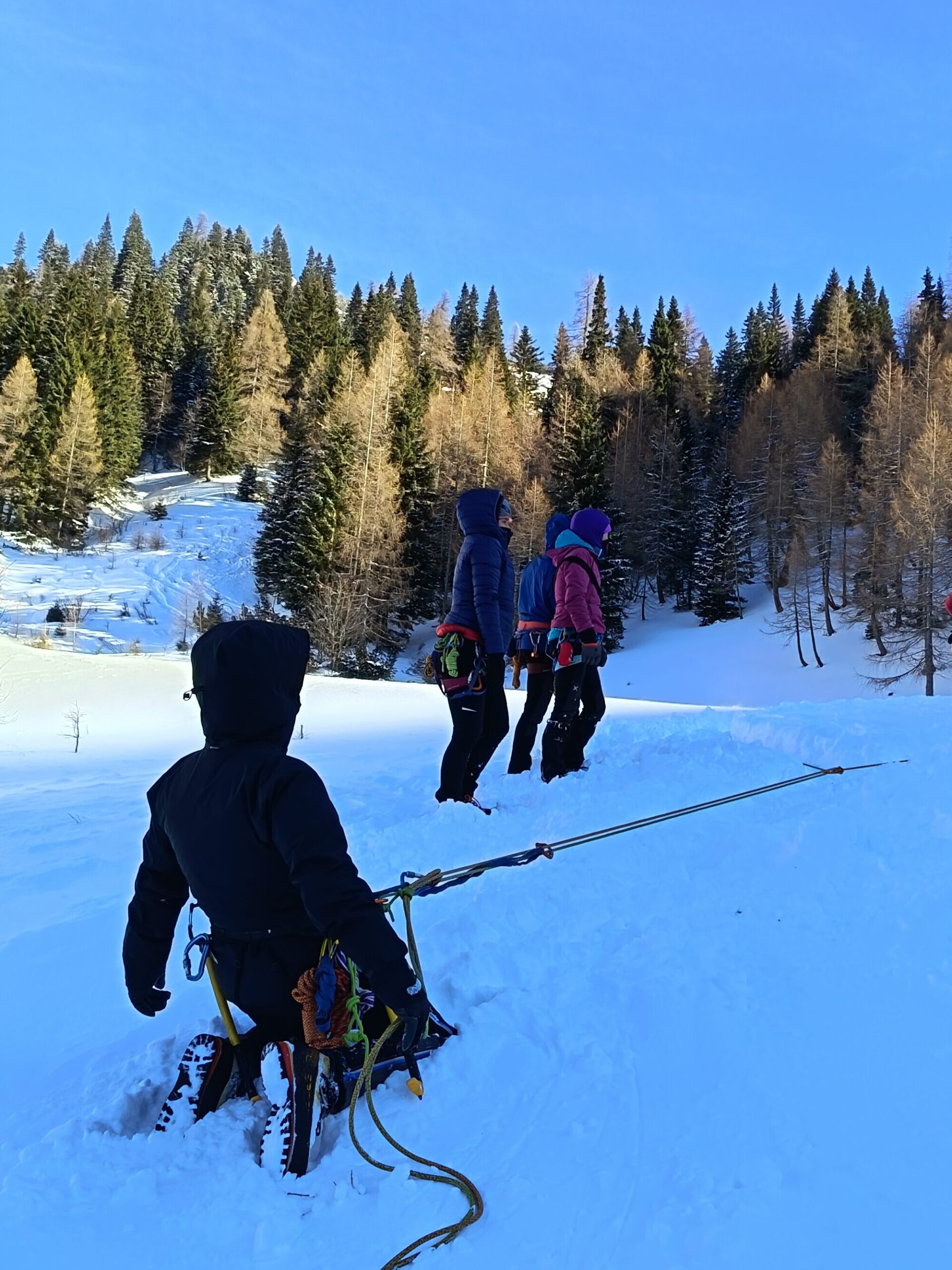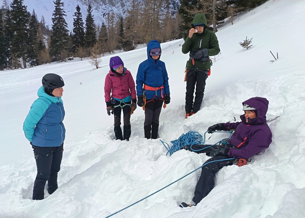 Letošnji prikaz zimske tehnike v okviru AŠ na Zelenici je bil v znamenju … zime. Vsaj kar se temperatur tiče. Brrrr. Tečajniki smo vestno še v temi štartali z Ljubelja, da bi bili pravočasno v polni bojni pripravljeni na delo. Snežilo je in temna tišina je bila popolna, sicer zratrakirana servisna cesta pa zaradi svežih par centimetrov prijetno mehka. Smučke na dostopu še niso trpele, pešcem je bilo malo težje. Komaj se nam je uspelo pravočasno pripraviti, saj je koča bila polna tujih ravno zbujenih  planincev, kateri so imeli svoje prioritete, in mi smo komaj prišli do prostora za preoblečt. Navlekli smo vse sloje, se poslovili od topline koče in se razdelili na tri postaje. Že prva vaja, gibanje naveze v snežnih smereh, nas je spomnila na snežne radosti iz otroštva. Izdelava sidrišča s pomočjo cepina je bila v plitvem pršiču pravi izziv. Prav fino pa je bilo se zasidrat v sneg in vadit varovanje. Katarina, Anja in Luka so vse postopke prikazali zelo razločno, a so naši podhlajeni možgani za preračunavanje, katera roka bo zapiralna, porabili kakšno sekundo več kot bi sicer. K sreči so vsi padalci preživeli.